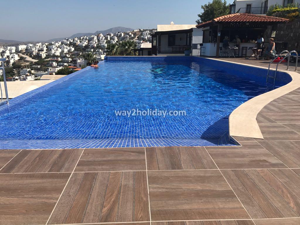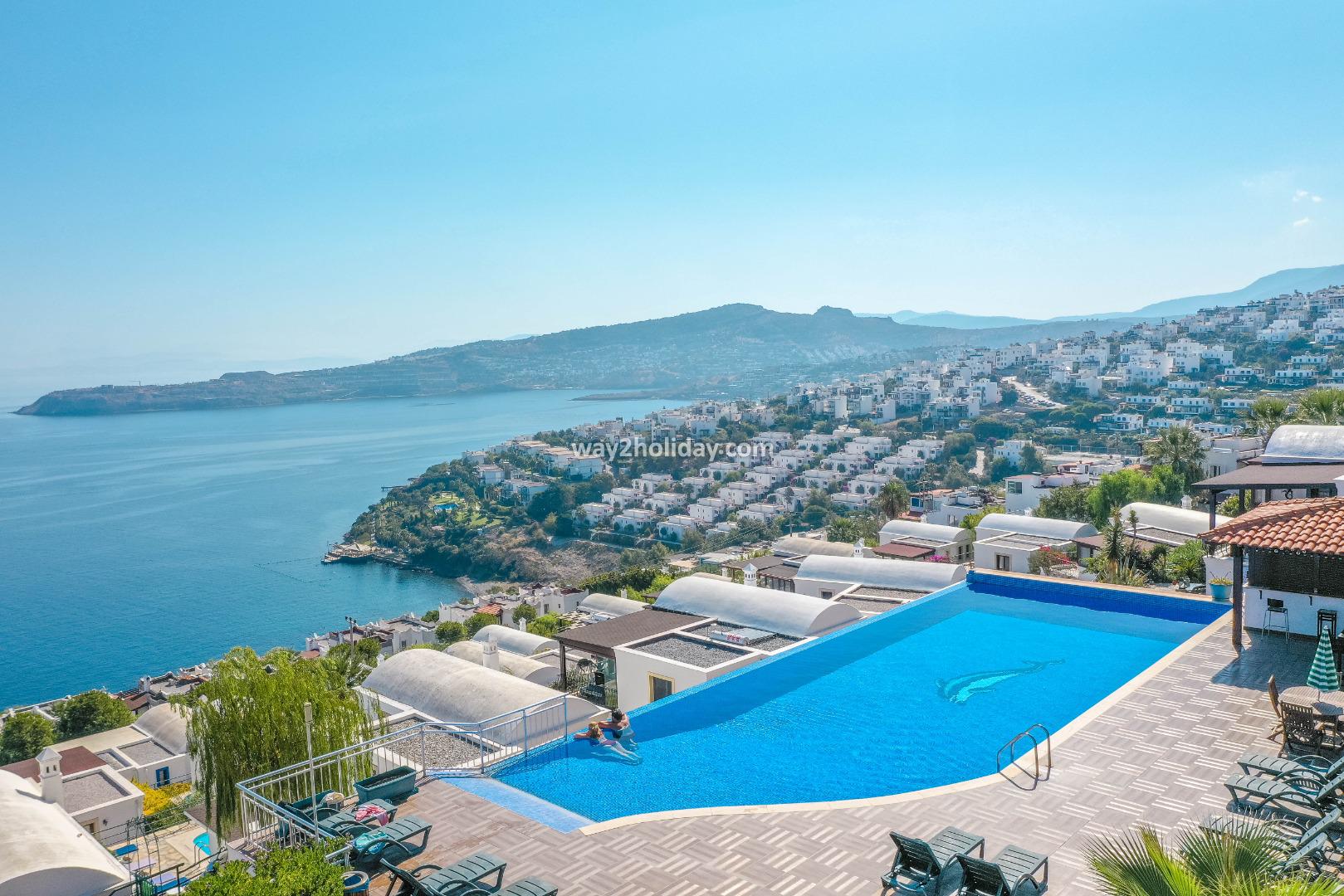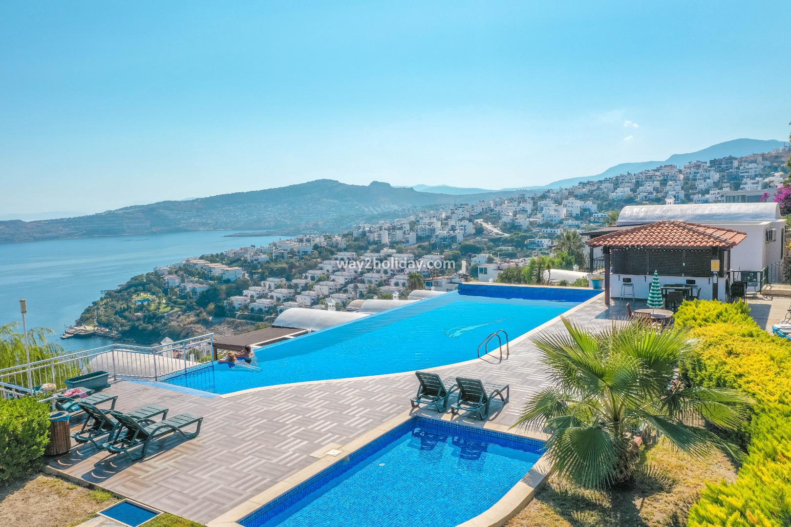 Villa Cumba has wonderful views of the sea from its position, perched in the hillside above the bay. There is a local supermarket and bakery, and a small restaurant all within 10 minutes on foot. The centre of Gundogan is a local minibus ride or 7 minute car journey away with excellent selection of beach front restaurants and cafes aswell as quaint harbour and sandy beach. There is a fantastic communal infinity pool which is is great for relaxing while absorbing the remarkable panorama. There is WiFi and air conditioning.