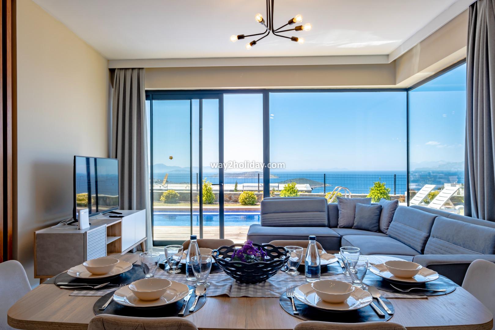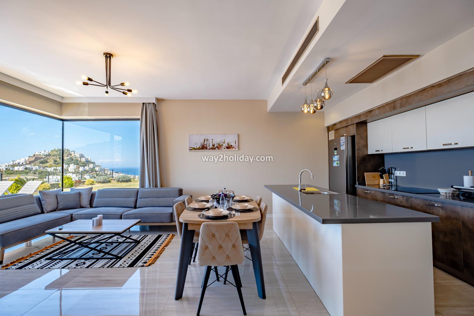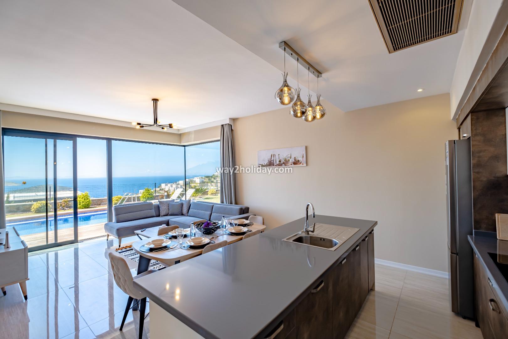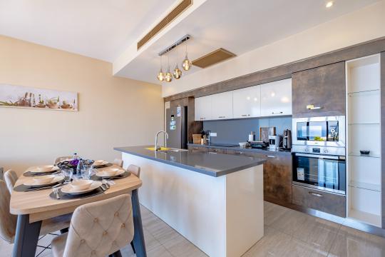 There is a large, open plan living space, all of which overlook the pool and sea views. The space is contemporarily furnished with comfortable sofas and a flat screen TV. The modern kitchen is fully equipped for your holiday meals. 2 sets of patio doors make the space bright and open onto a spacious terrace with dining table and chairs - perfect for alfresco dining with a view!