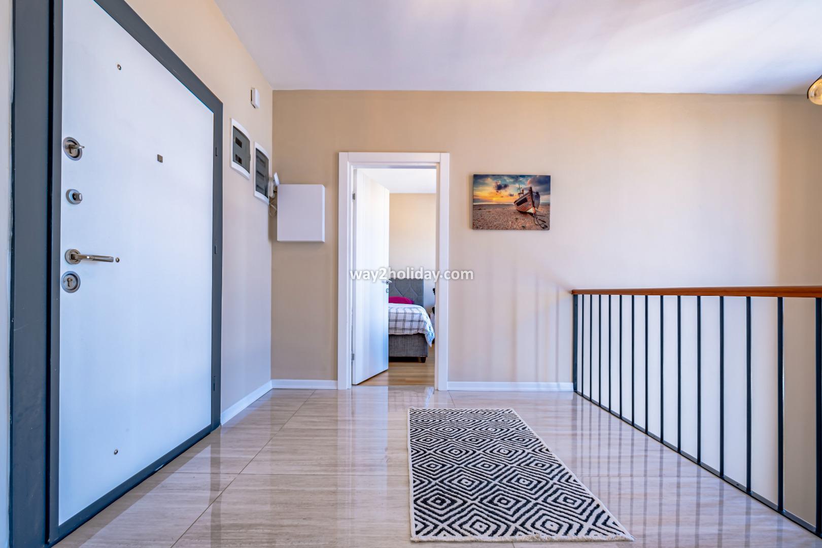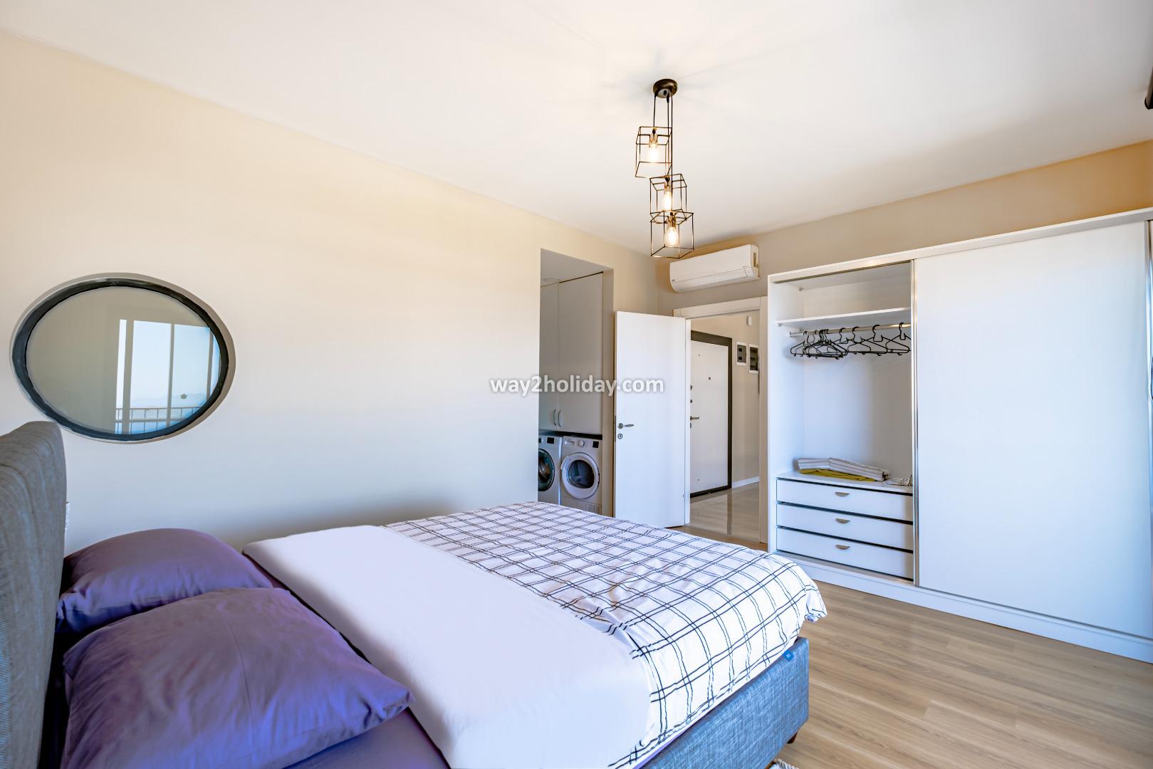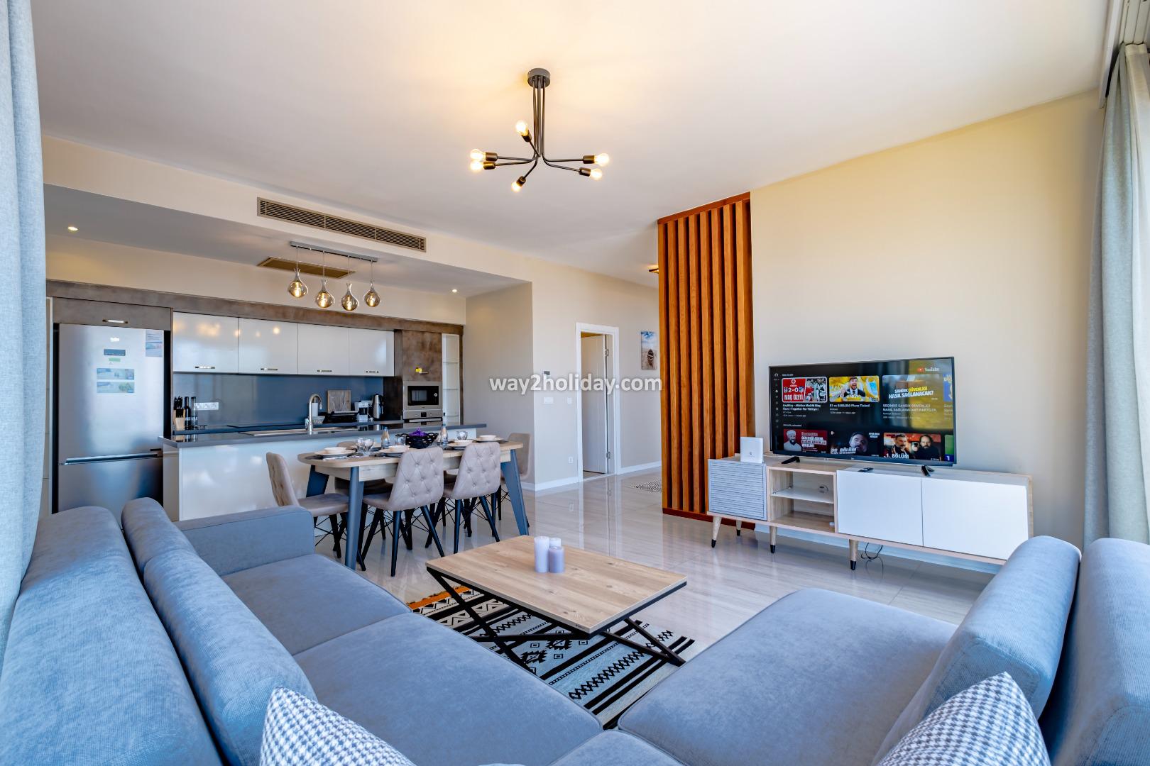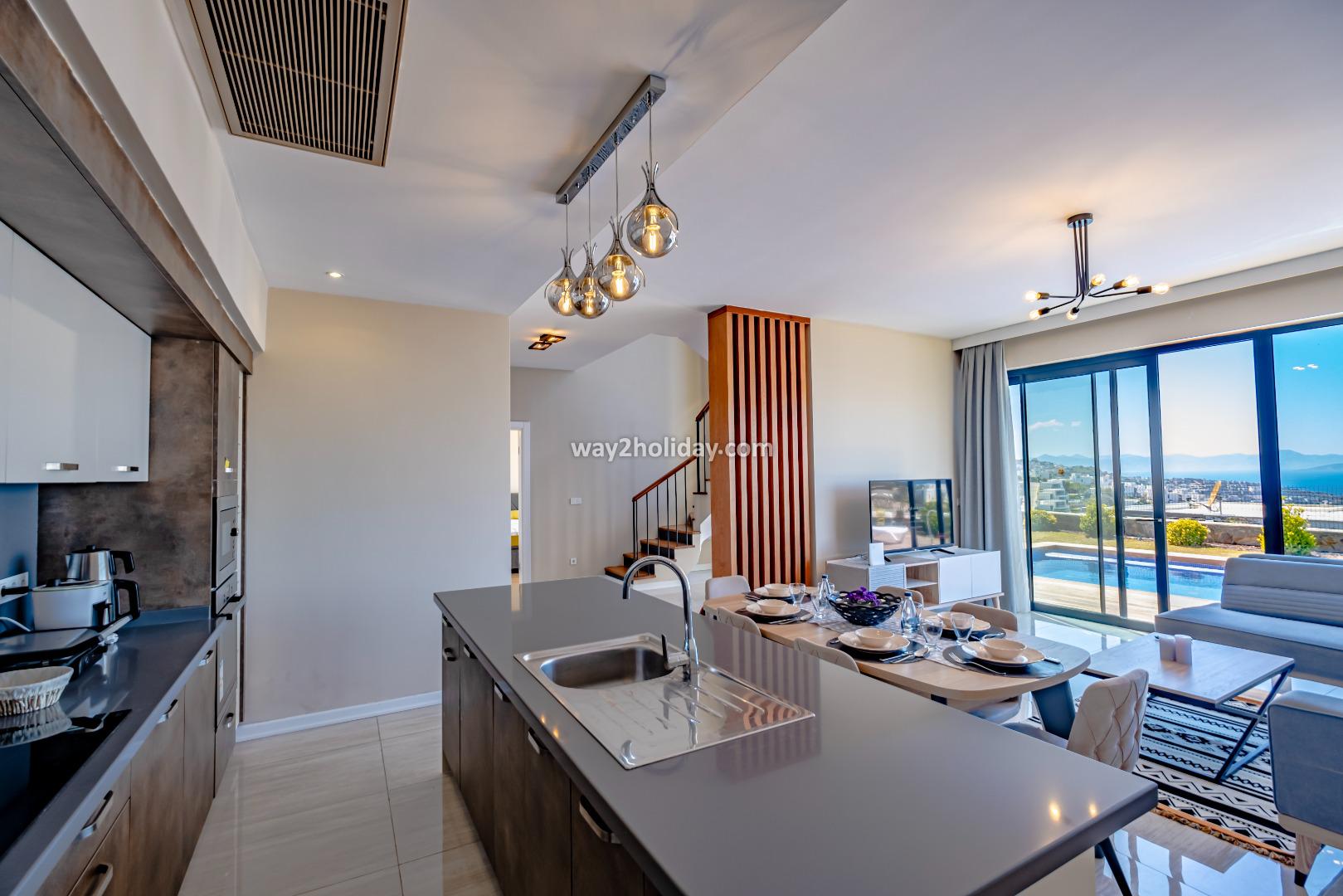 There is a large, open plan living space, all of which overlook the pool and sea views. The space is contemporarily furnished with comfortable sofas and a flat screen TV. The modern kitchen is fully equipped for your holiday meals. 2 sets of patio doors make the space bright and open onto a spacious terrace with dining table and chairs - perfect for alfresco dining with a view!