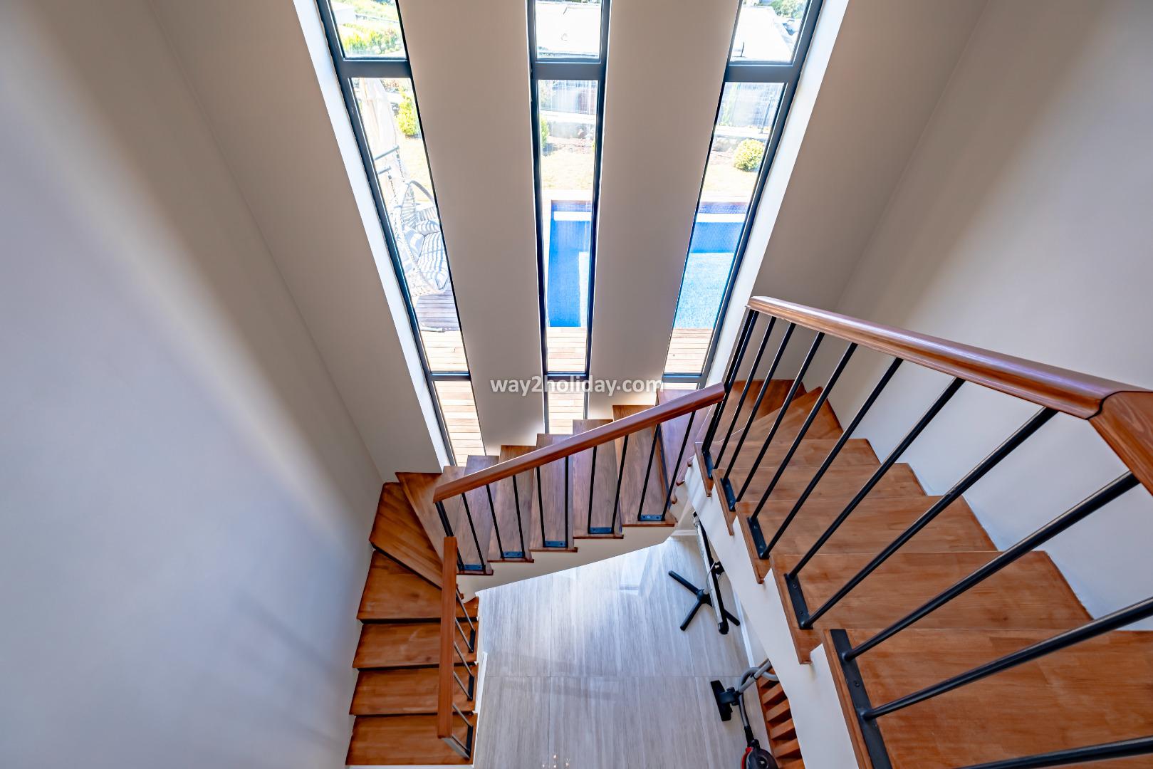 There are 3 modern bedrooms, all of which have en suite shower rooms and are decorated in neutral tones. On the ground floor is a double bedroom with patio doors that open onto the pool area. Upstairs, you’ll find ensuite double and twin bedrooms that have private balconies with stunning sea views.