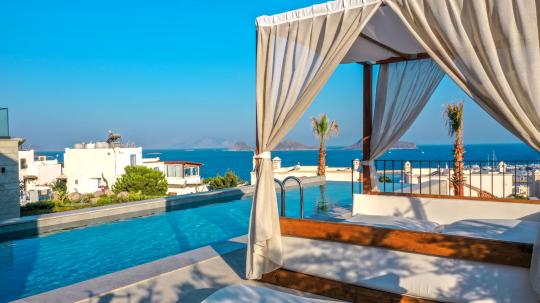 Offering you a stylish and spacious holiday, Villa Vistaport 2 is a modern 6 bedroom villa with a private pool and private gardens, located in the popular resort of Turgutreis Bodrum Turkey. There is a choice of sandy beaches, restaurants and shops within a 15 minutes' walk and the popular resorts of Yalikavak or Bodrum itself a is also a short drive away. Elegantly furnished throughout and with a stylish pool terrace to enjoy, this ultra-modern property makes an excellent choice. There is WiFi and air conditioning/heating.