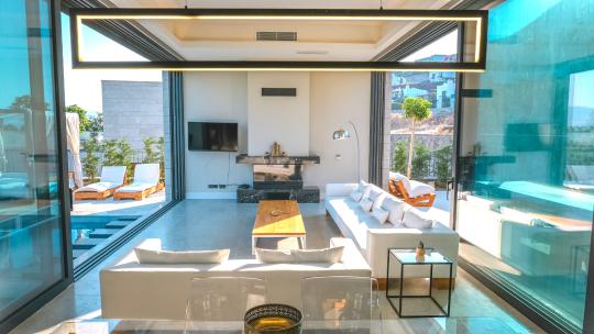The inviting infinity pool is perfect for topping up on your tan (10m * 12m and depth 1.5m) or chill out in the covered kamelya. A set of steps lead down to the lawned garden area and chill-out area with comfortable seating - the perfect idyll from which to enjoy the stunning sea views. The living room itself is actually like an outdoor balcony with large sliding doors to front and rear- what better place to relax with a glass of wine and watch the sun set.