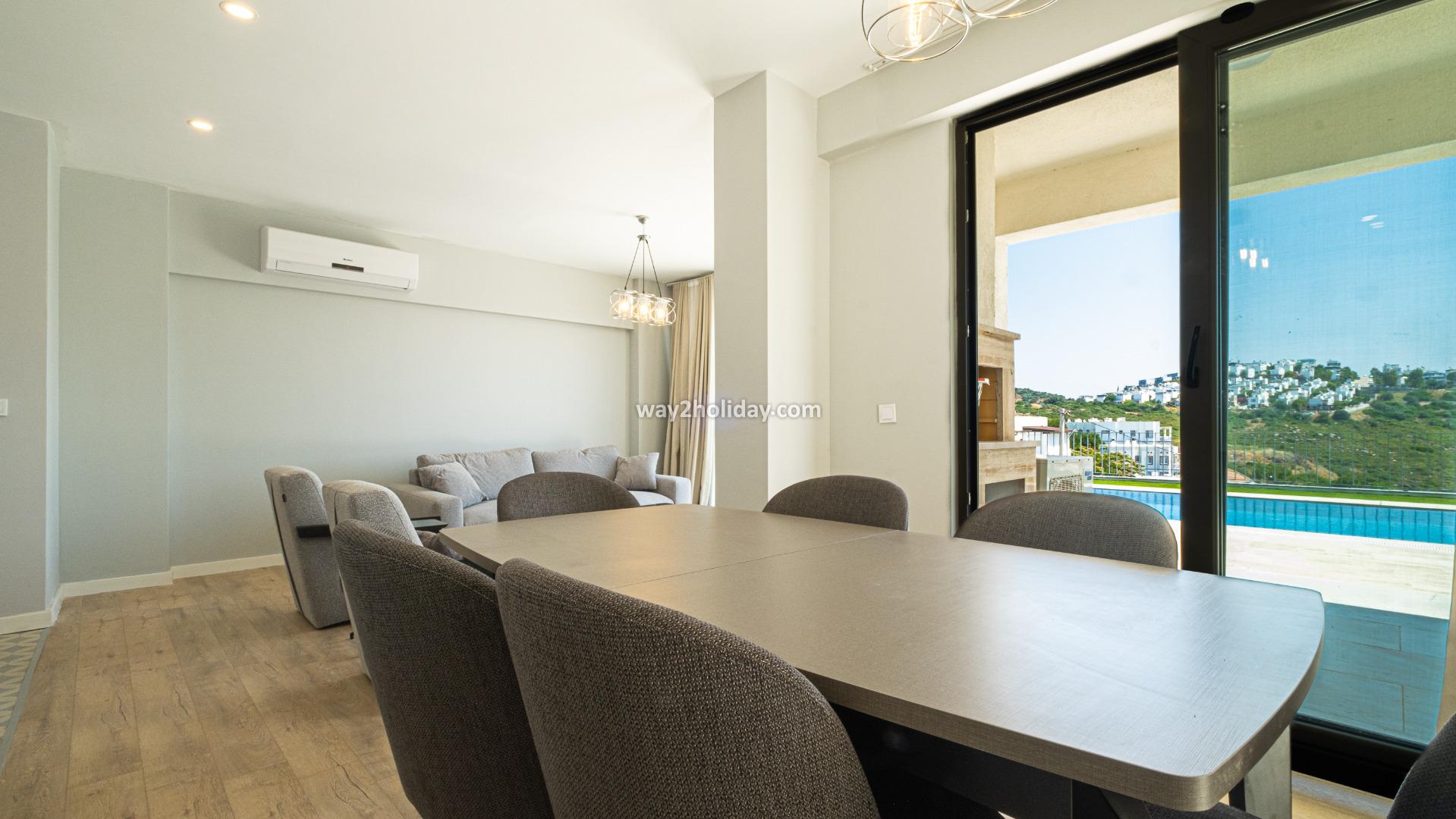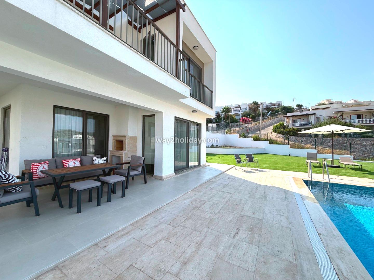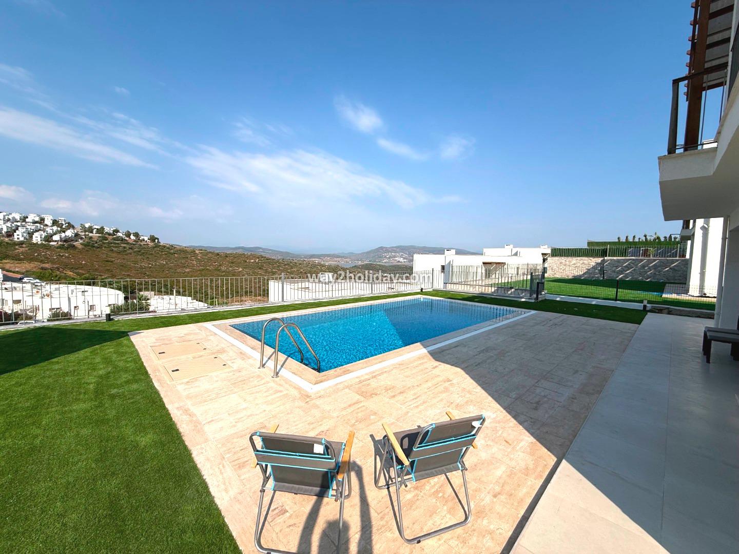 Villa Zuma is a stunning 3 bedroom property with lovely green views. The villa has a modern and contemporary finish throughout. The private pool, terrace and living room all focus on the panoramic views. Located in the countryside, close to the main Bodrum airport (15 mins drive) and 40 minutes drive from Bodrum itself, a 5 minute drive takes you to the popular village resort of Boğazici with an array of water fron restaurants, pizzarias and a sandy beach. WiFi, and air conditioning/ heating in the bedrooms, dining room, kitchen and living space are included.