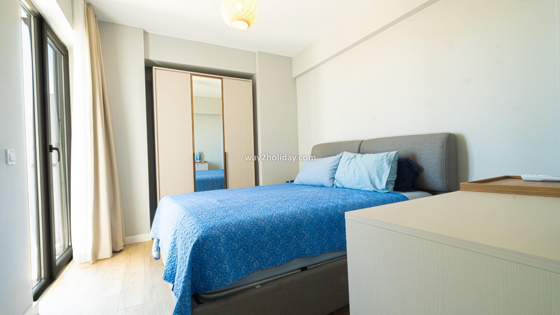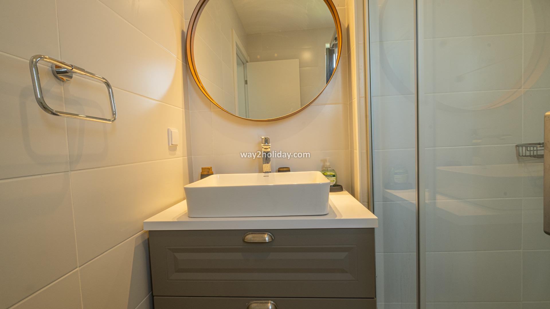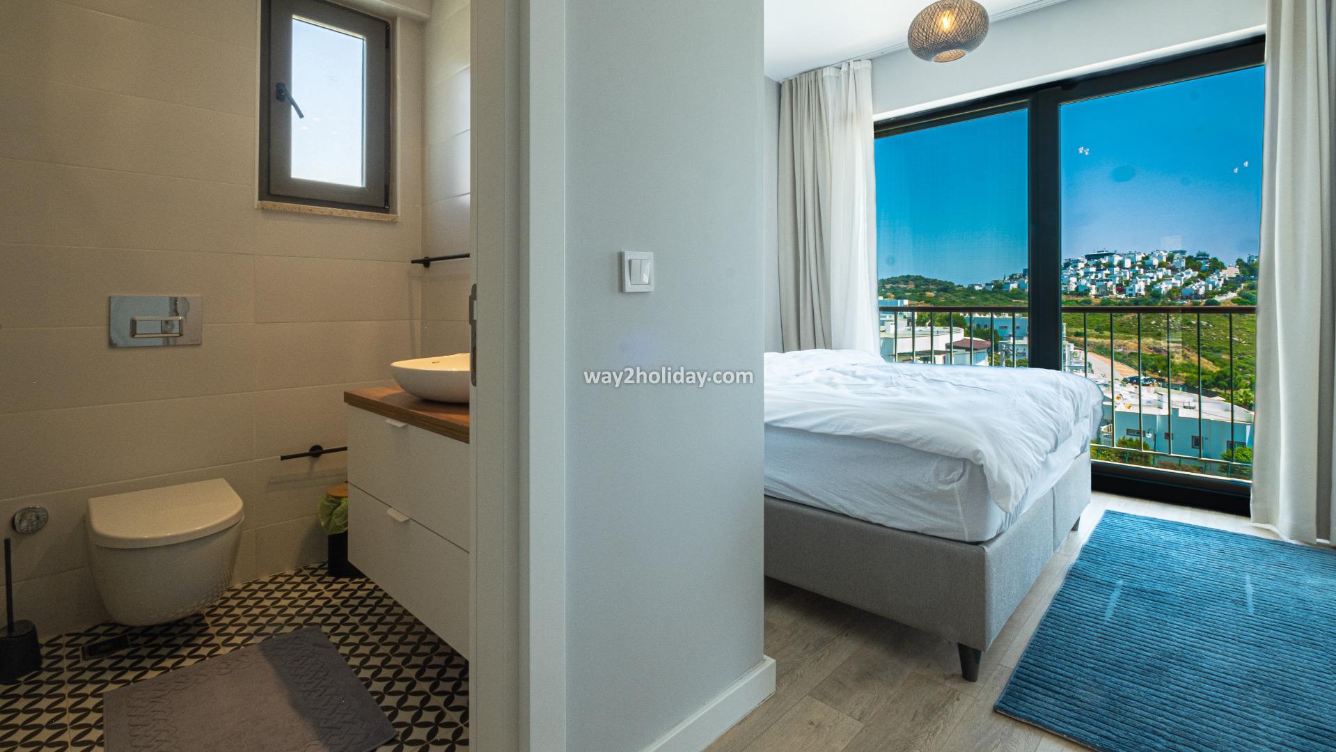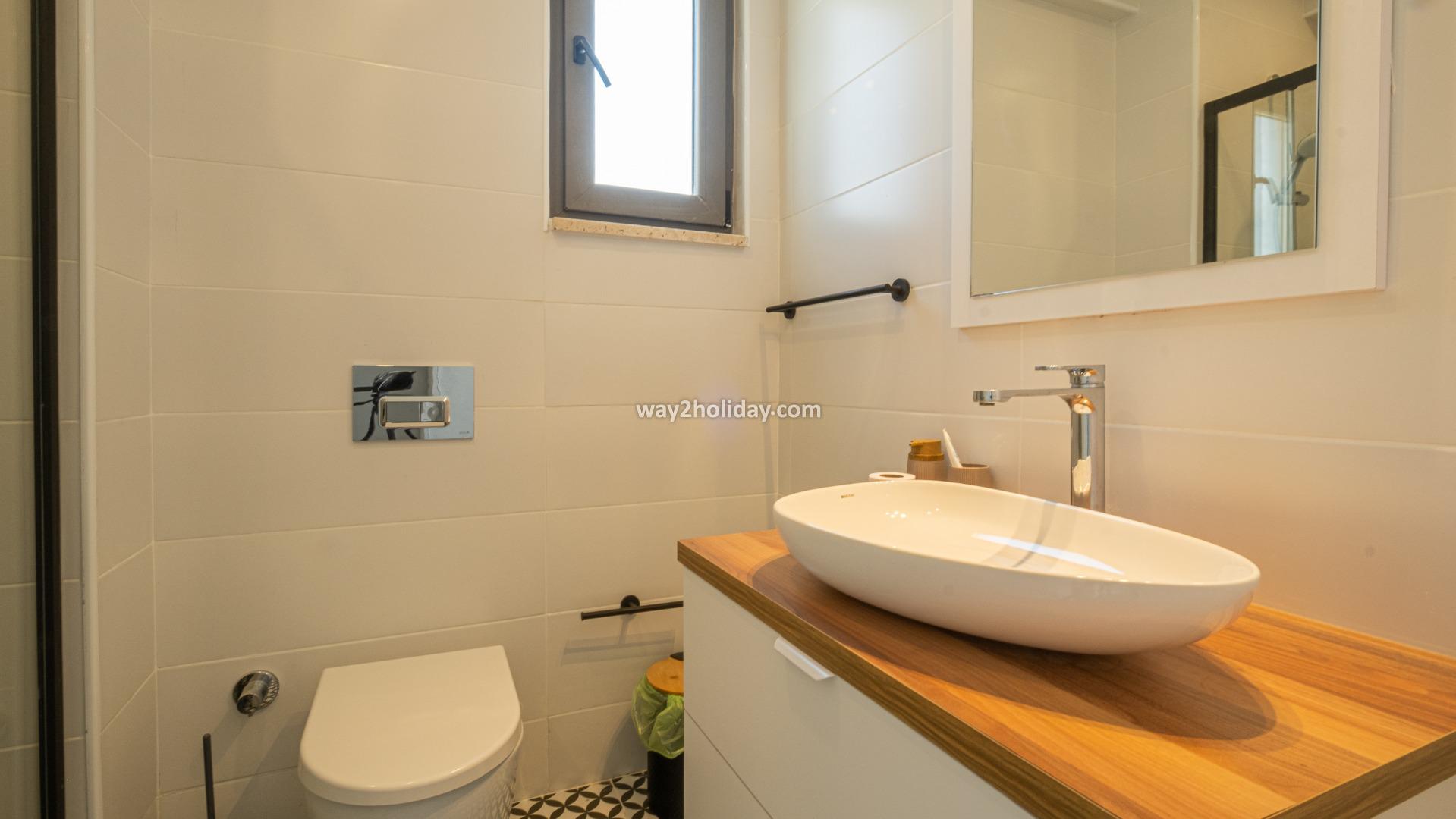 There are 3 modern bedrooms, decorated in neutral tones and 3 bathrooms (one ensuite). On the entrance top floor are the 3 bedrooms- you’ll find 2 double and one wide single bed (could fit 2 small children) bedroom that share a large, covered and wraparound balcony with stunning views.