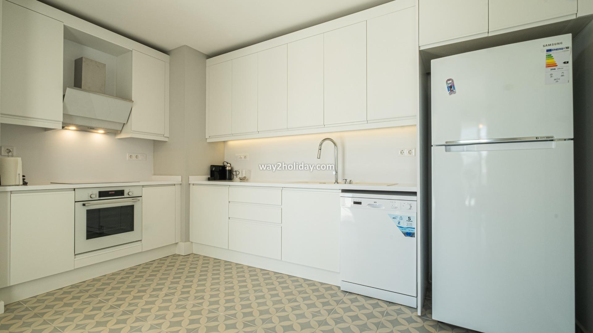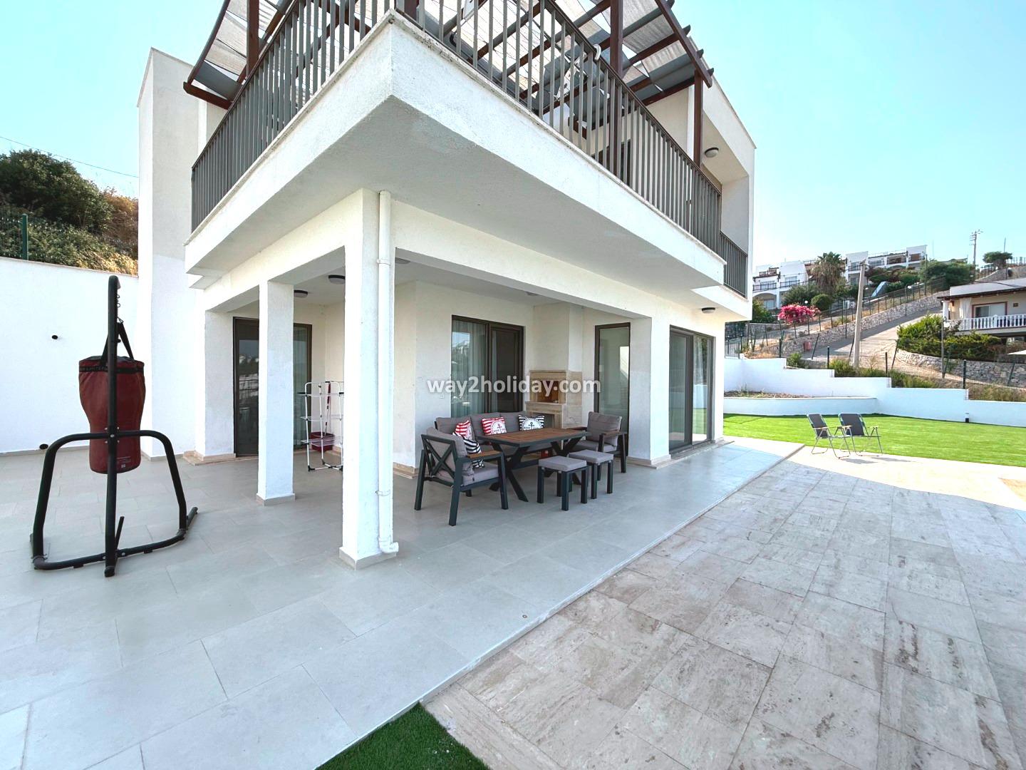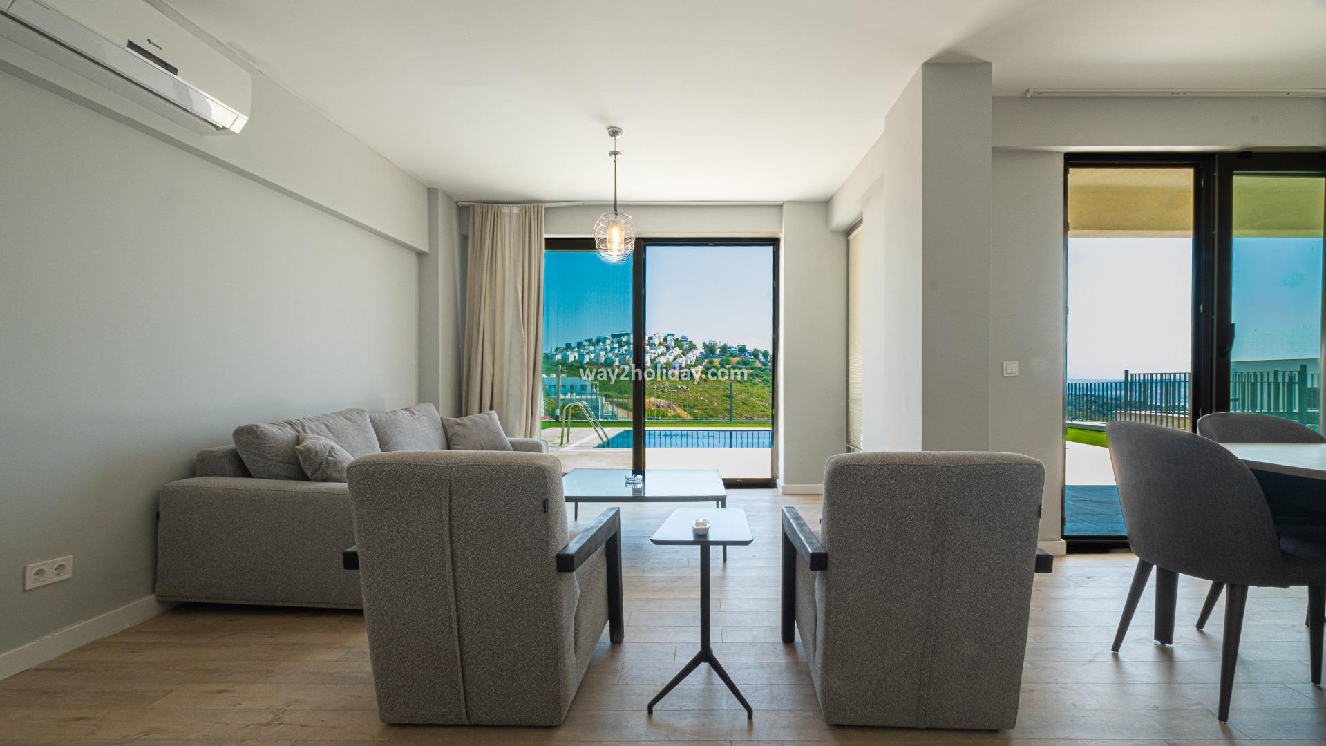 There is a large, open plan living space, all of which overlook the pool and views. The space is contemporarily furnished with comfortable sofas and a flat screen TV. The modern kitchen is fully equipped for your holiday meals. 2 sets of patio doors make the space bright and open onto a spacious terrace with dining table and chairs - perfect for alfresco dining with a view!