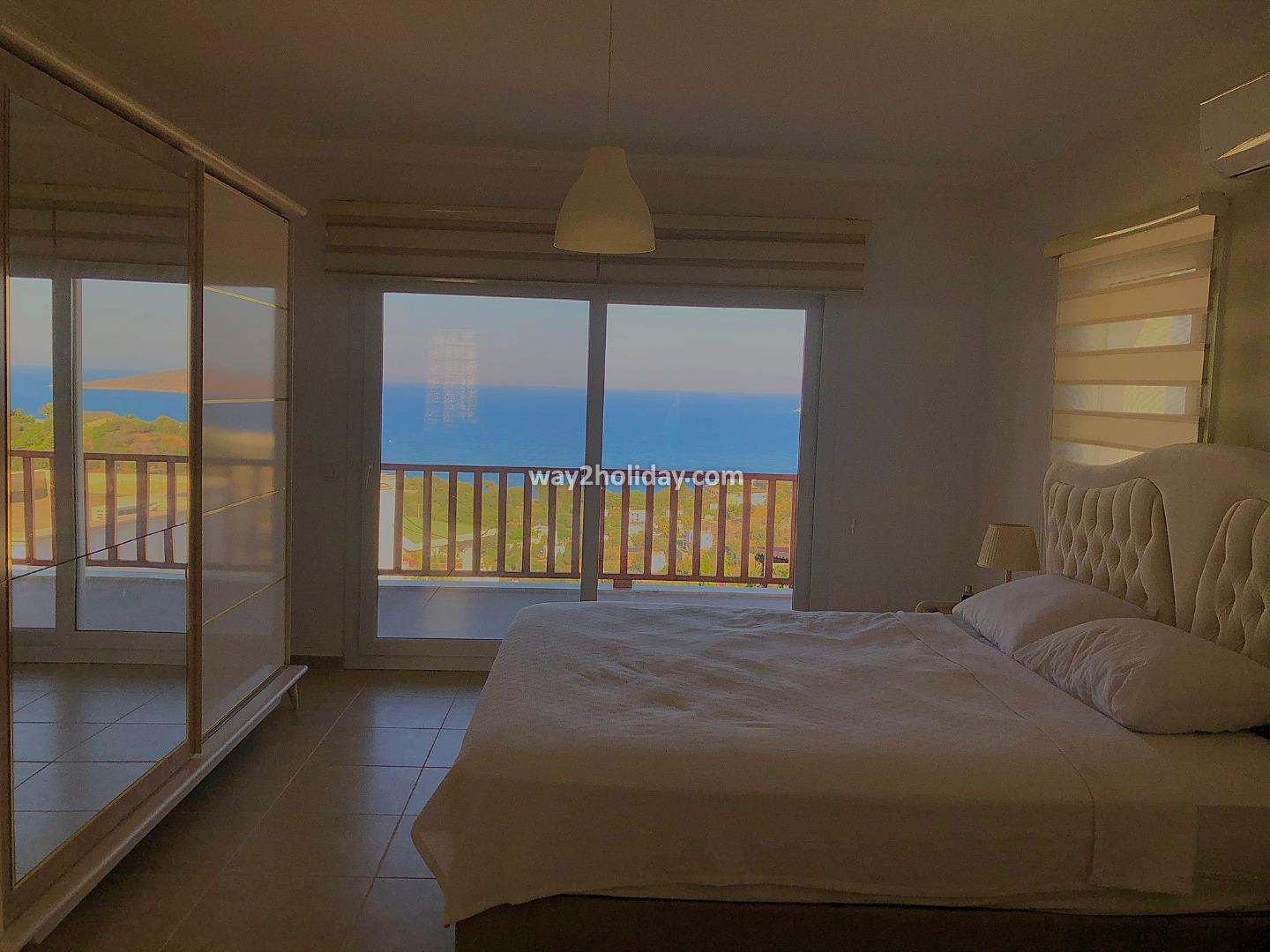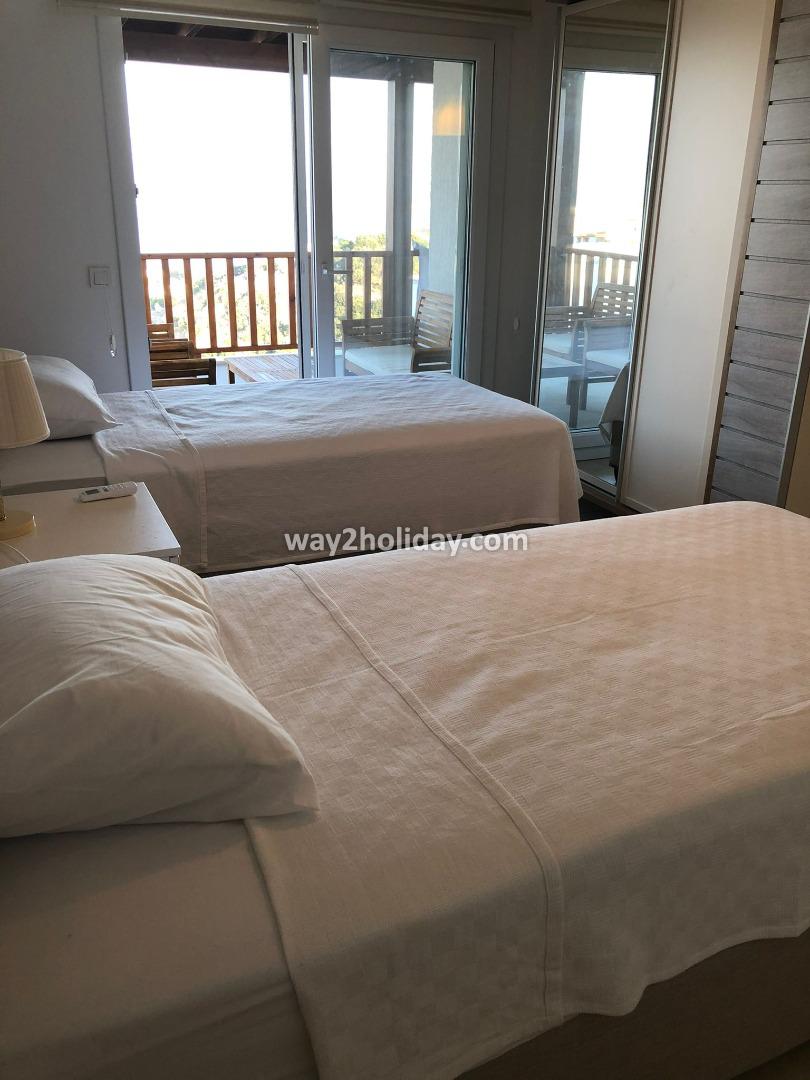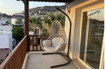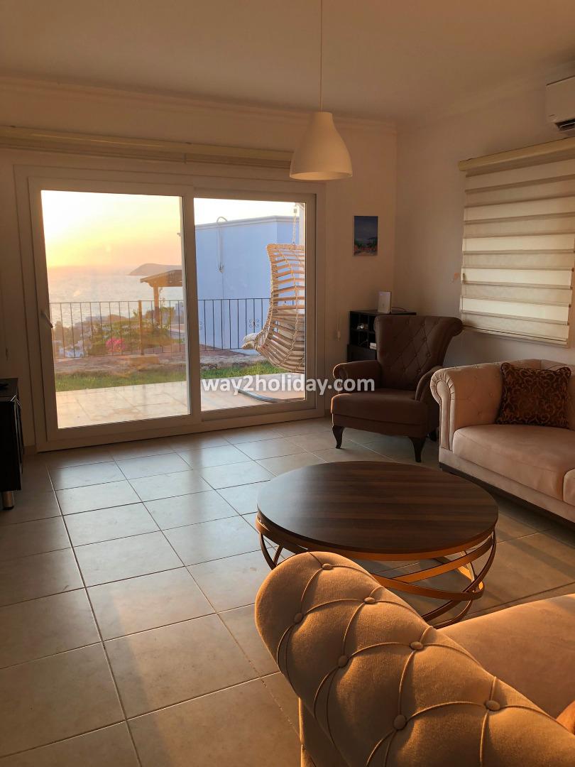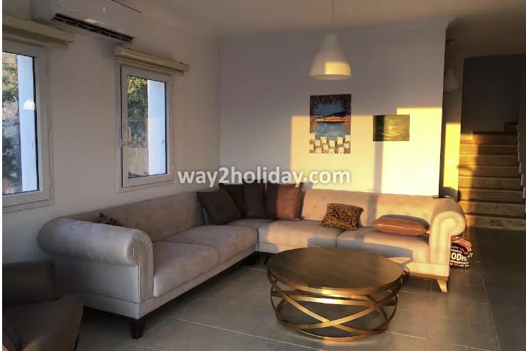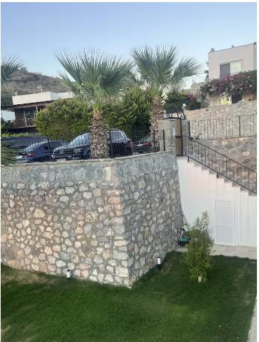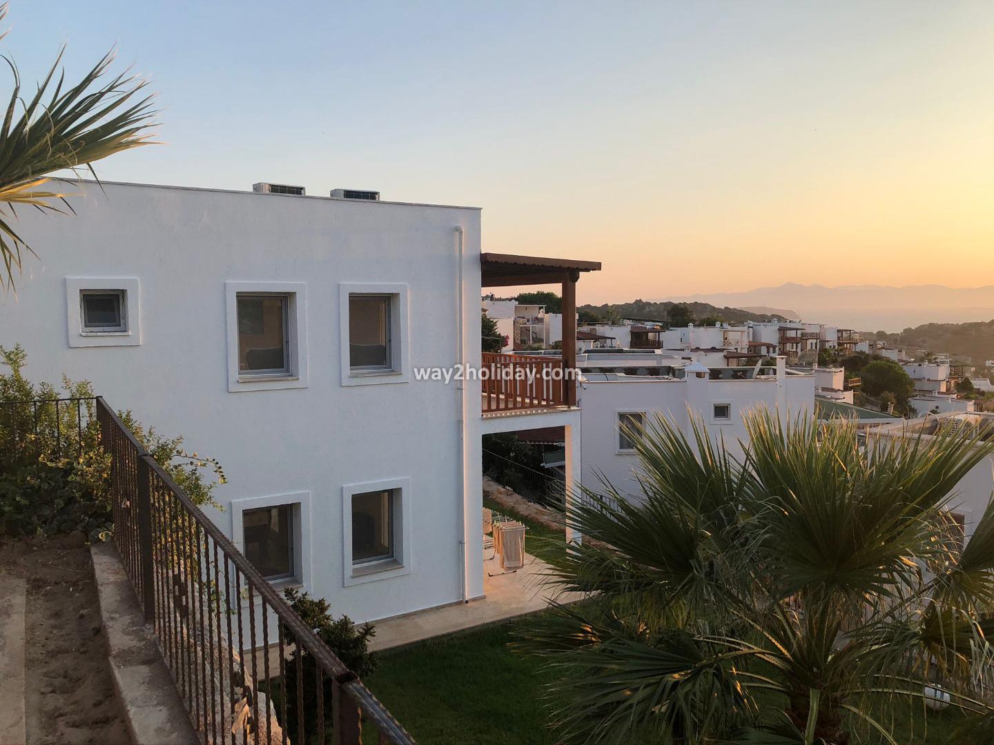 Located within a gated community in Gümüşlük Koyunbaba, this duplex villa boasts stunning views of the islands of Kalymnos and Leros.