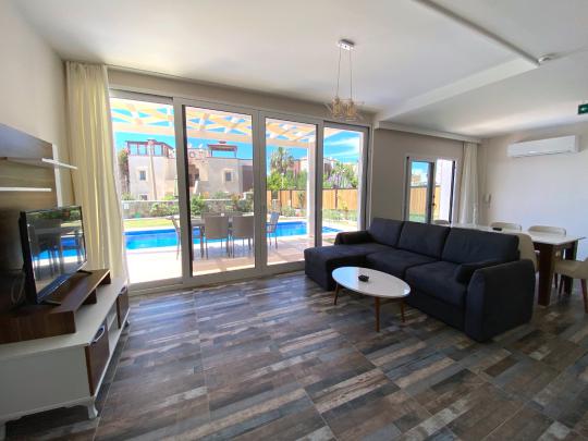 Conveniently located between Yalikavak and Gumusluk Villa Karamel is a modern duplex villa with private pool with both sea and nature views. A great place to enjoy the peace and quiet yet close enough to enjoy either the tranquil fishing village of Gumusluk or the brand new Palmamarina in Yalikavak. There are 10 private pool villas on this small compound each with private garden area and pool. Above the dupex villas are private penthouse apartments and there is a seperate shared pool and shared gardens for their communal usage which you can also use if you wish to socialize. There are 3 double bedrooms and 3 bathrooms which are fully equipped with everything you may need. The compound has a 7/24 security camera system, fire and safety systems and extra generator. The reception area is connected via telephone to each accommodation and netween certain times of the day you can give orders to the supermarkets for delivery. Electric and water is charged as extra according to usage