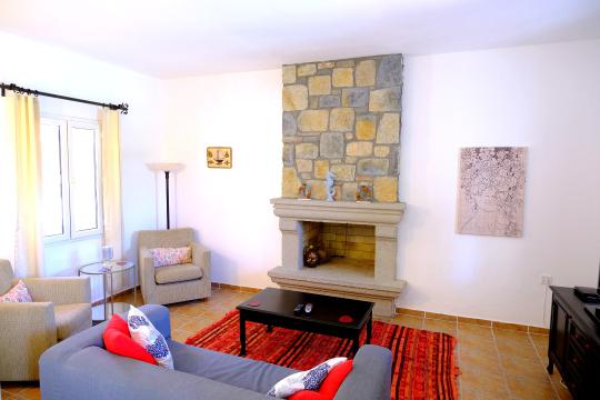 The front door opens into the open plan living area with traditional decor. There's a fully equipped kitchen and the lounge area with a sofa, TV, feature fireplace and dining table and chairs. Sliding patio doors from the lounge lead out onto the covered patio/pool area and flood the villa with natural light. A central staircase leads up to the first floor .
