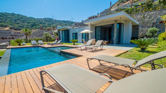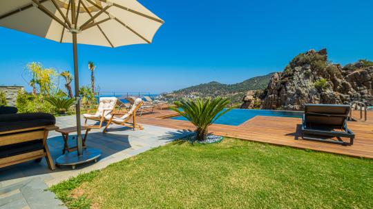 Villa Rock is located on the hillside on the outskirts of Yalikavak with stunning sea view and private pool. This is a single storey villa with 3 bedrooms and three bathrooms, two of which are ensuite. Each of the bedrooms can access the pool and gardens directly.