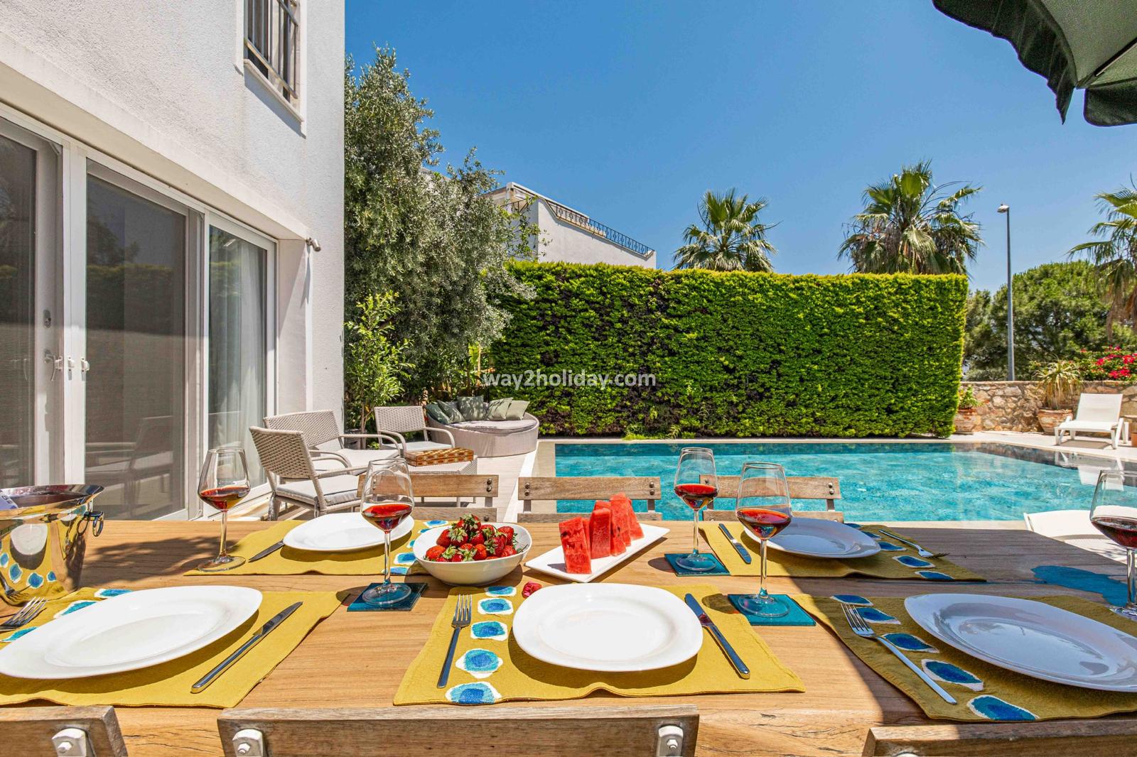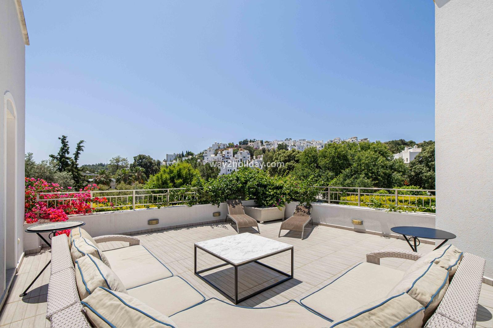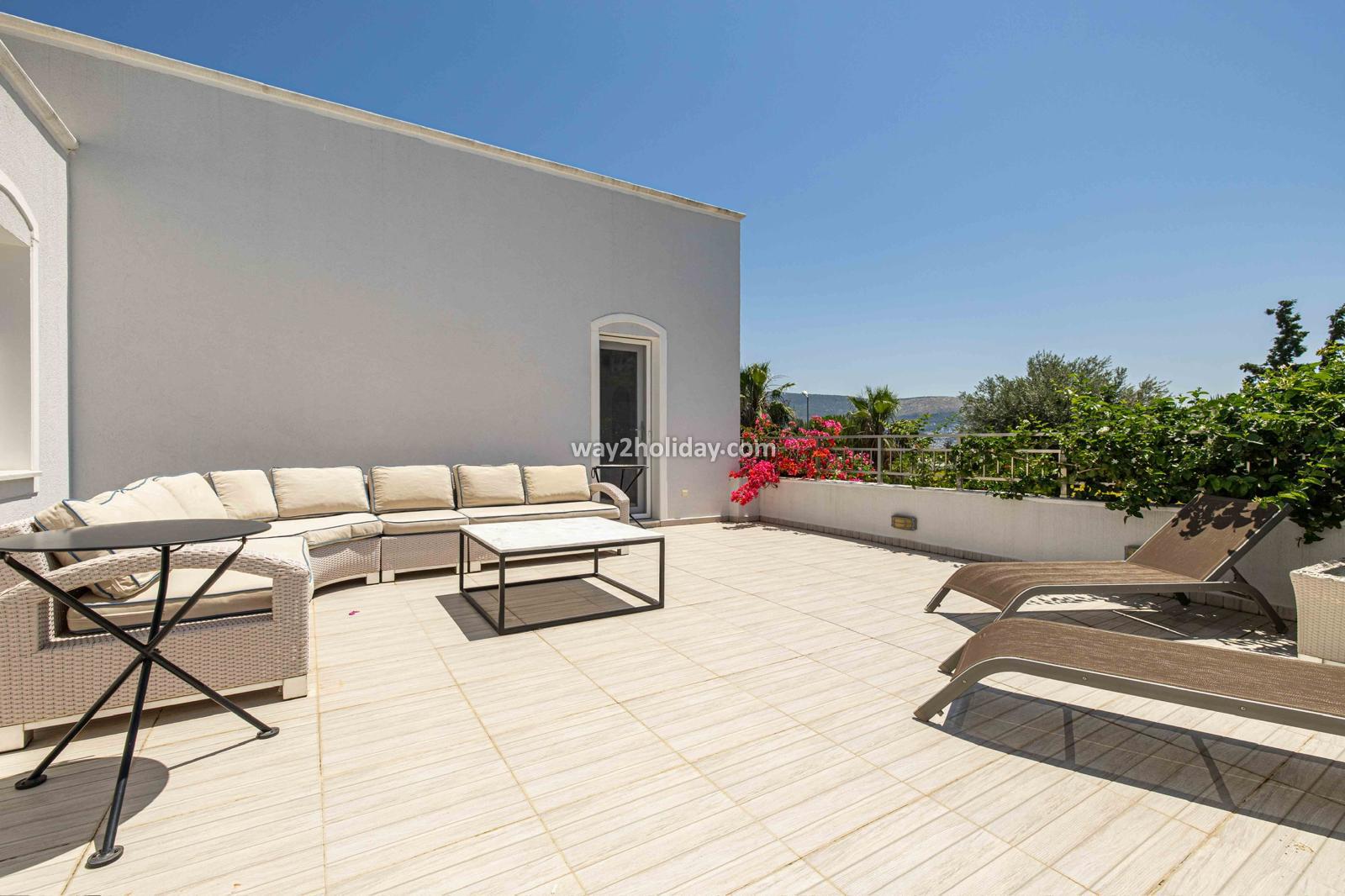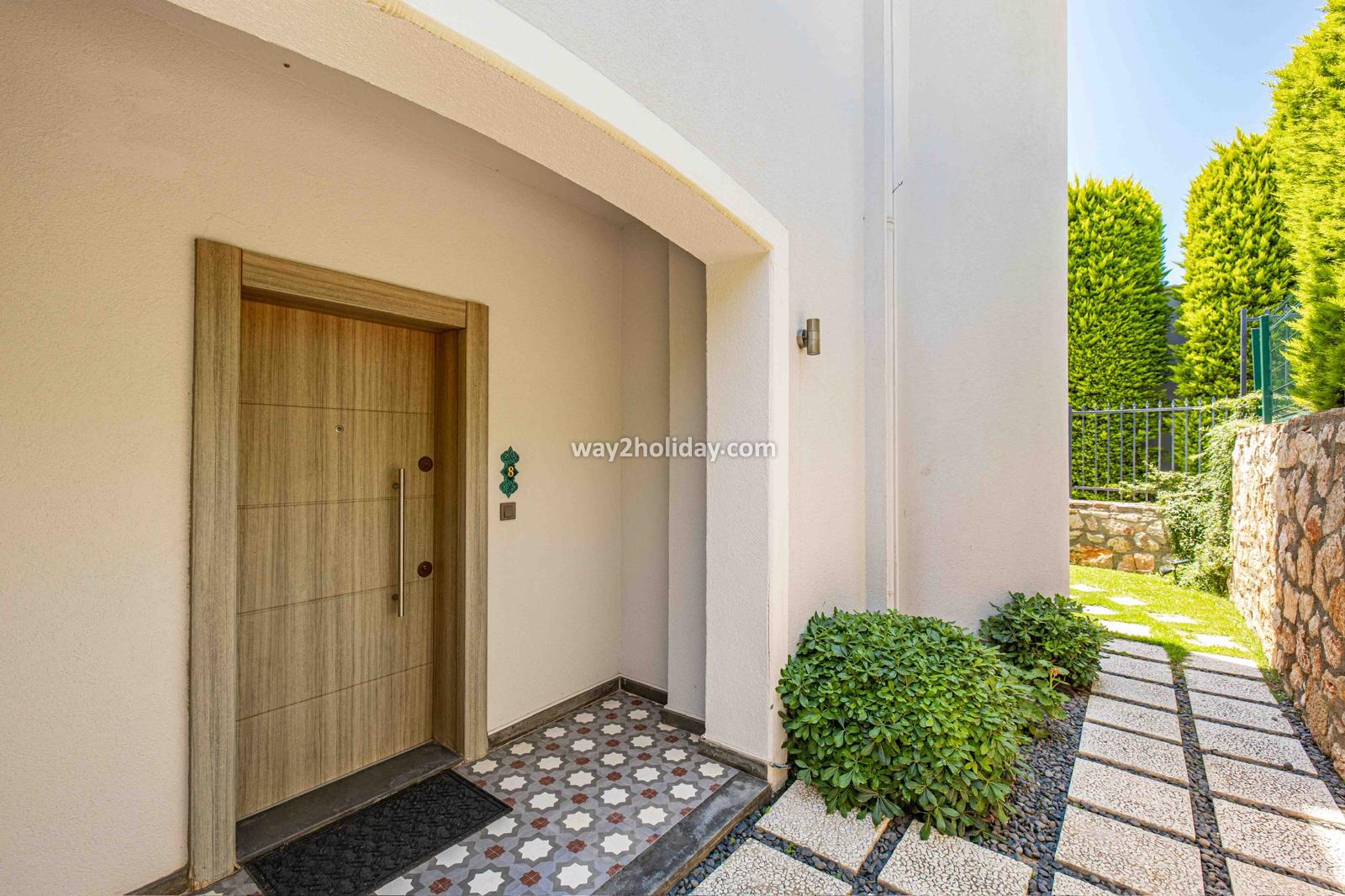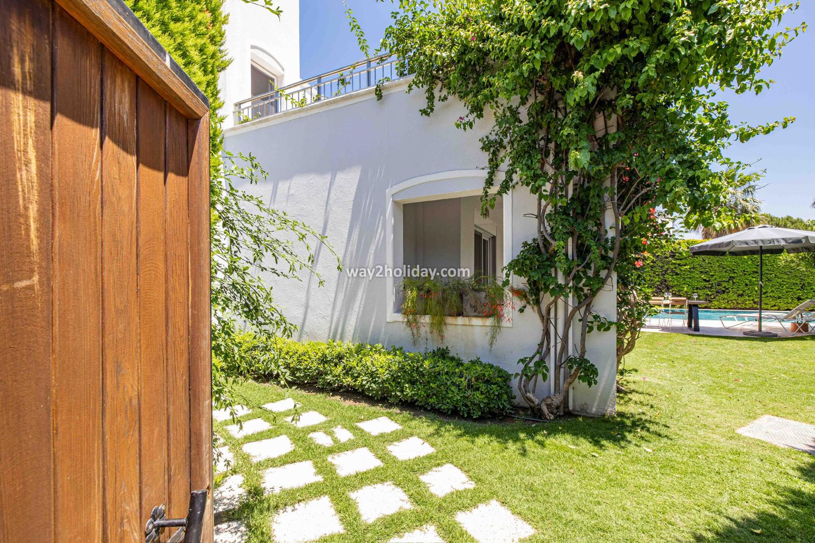 Villa White House, a fully detached villa in a gated community away from the noise in Bodrum Center, awaits you for an unforgettable Bodrum holiday. The villa is approximately 1.5 km from Bodrum Marina and 3-4 minutes by car from markets, restaurants, Bodrum Bazaar and shops. Upon entering our duplex villa, you are greeted by a spacious living room and open kitchen. Both areas have access to the large garden and poolside. This floor also includes a bedroom with a double bed, a shared bathroom and a work desk. Upstairs, a large terrace with a seating area awaits you. This floor has 3 bedrooms, one with an en-suite bathroom, and a shared bathroom. With a total of 4 bedrooms and 3 bathrooms, our villa accommodates 8 people.