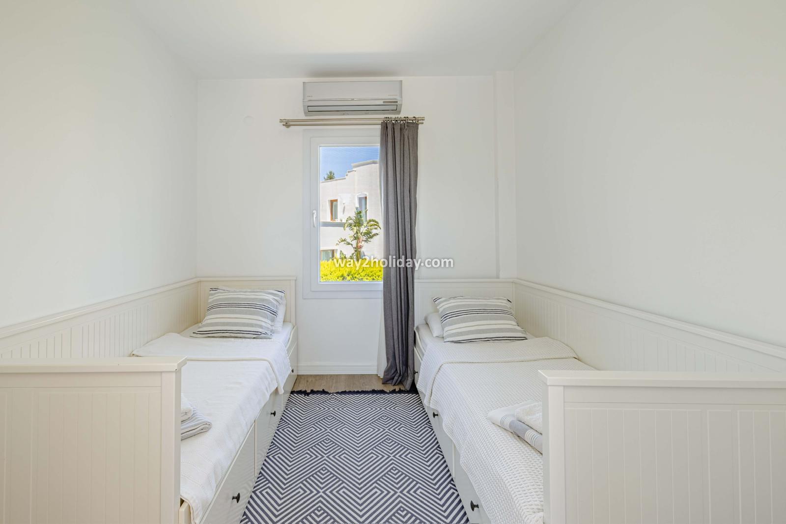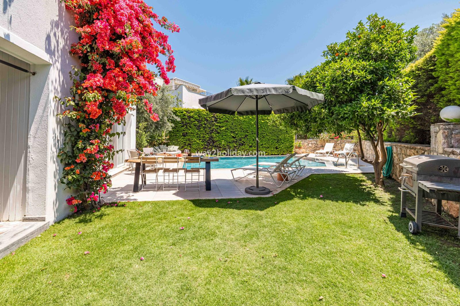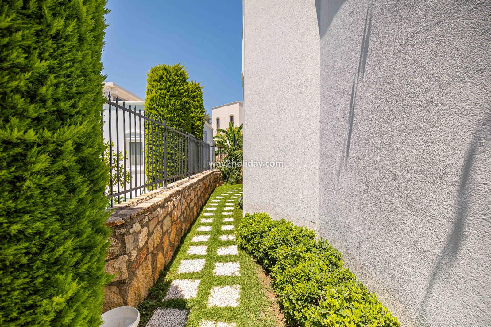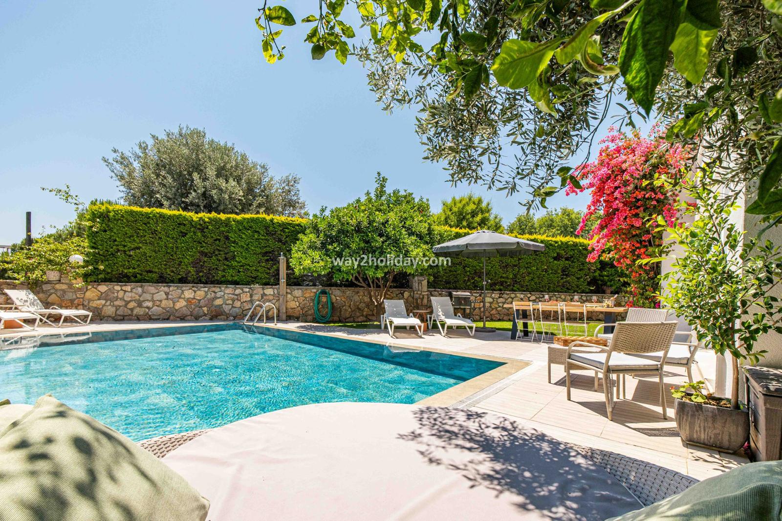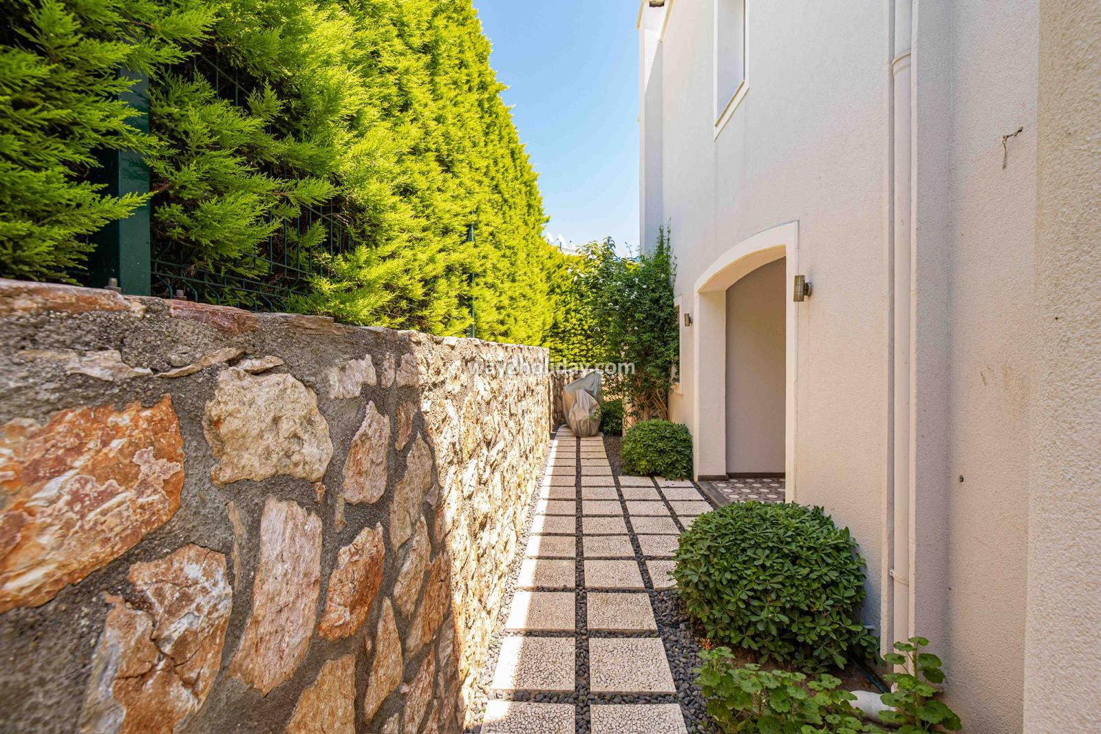 Villa White House, a fully detached villa in a gated community away from the noise in Bodrum Center, awaits you for an unforgettable Bodrum holiday. The villa is approximately 1.5 km from Bodrum Marina and 3-4 minutes by car from markets, restaurants, Bodrum Bazaar and shops. Upon entering our duplex villa, you are greeted by a spacious living room and open kitchen. Both areas have access to the large garden and poolside. This floor also includes a bedroom with a double bed, a shared bathroom and a work desk. Upstairs, a large terrace with a seating area awaits you. This floor has 3 bedrooms, one with an en-suite bathroom, and a shared bathroom. With a total of 4 bedrooms and 3 bathrooms, our villa accommodates 8 people.