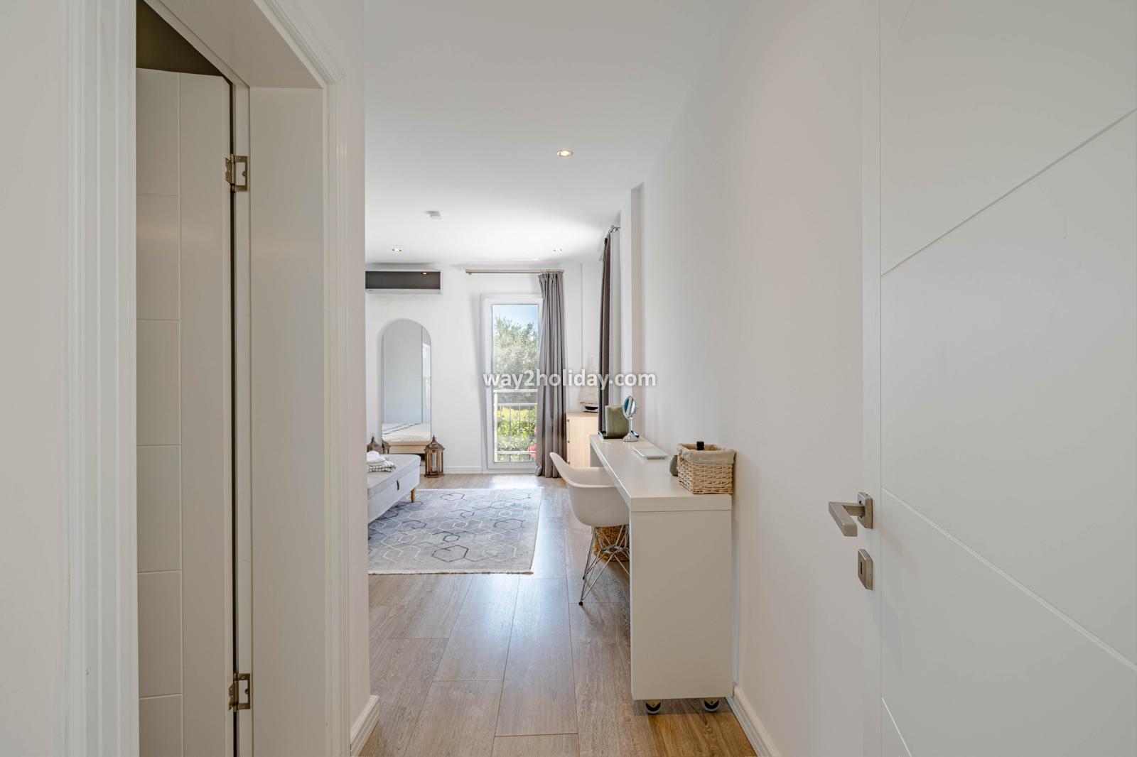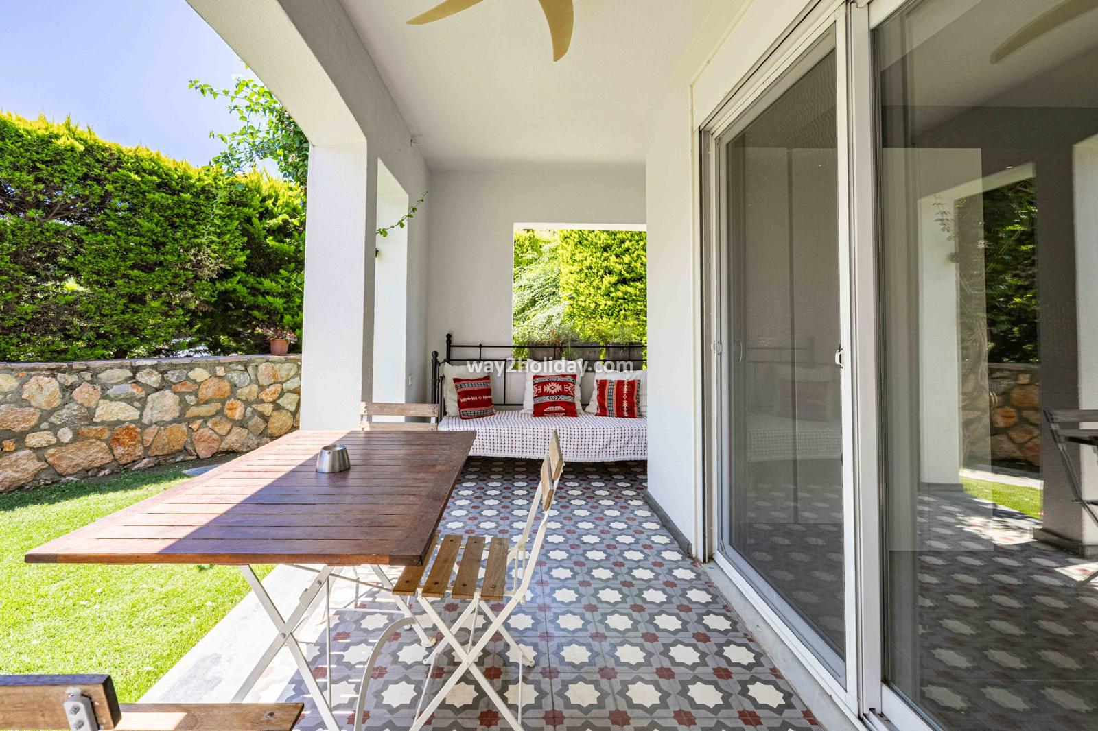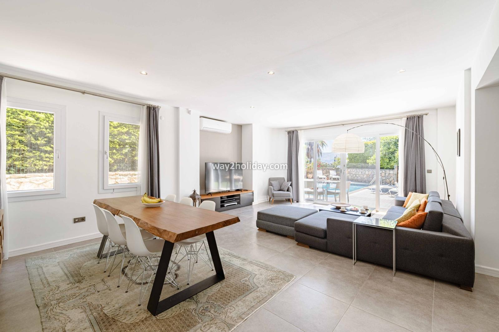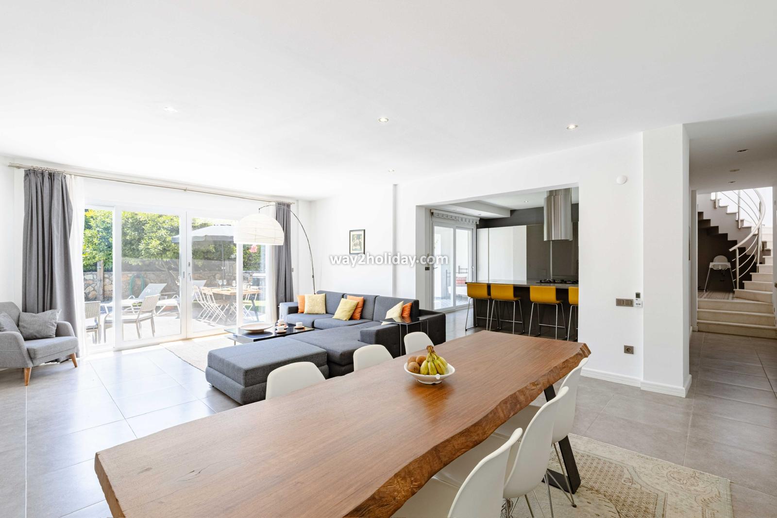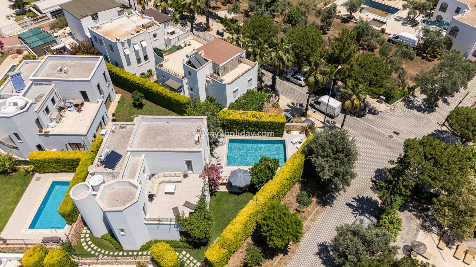 Villa White House, a fully detached villa in a gated community away from the noise in Bodrum Center, awaits you for an unforgettable Bodrum holiday. The villa is approximately 1.5 km from Bodrum Marina and 3-4 minutes by car from markets, restaurants, Bodrum Bazaar and shops. Upon entering our duplex villa, you are greeted by a spacious living room and open kitchen. Both areas have access to the large garden and poolside. This floor also includes a bedroom with a double bed, a shared bathroom and a work desk. Upstairs, a large terrace with a seating area awaits you. This floor has 3 bedrooms, one with an en-suite bathroom, and a shared bathroom. With a total of 4 bedrooms and 3 bathrooms, our villa accommodates 8 people.